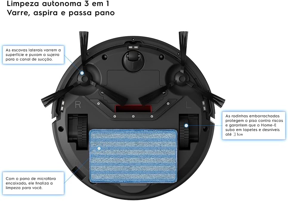 Sua funcionalidade, no entanto, vai muito além. Ele opera em um sistema 3 em 1, que varre, aspira e passa pano úmido. As escovas laterais trabalham para varrer a sujeira dos cantos para o bocal de sucção, que aspira eficientemente as partículas. Por fim, um mop acoplado passa um pano úmido para finalizar a limpeza, uma função excelente para pisos frios.